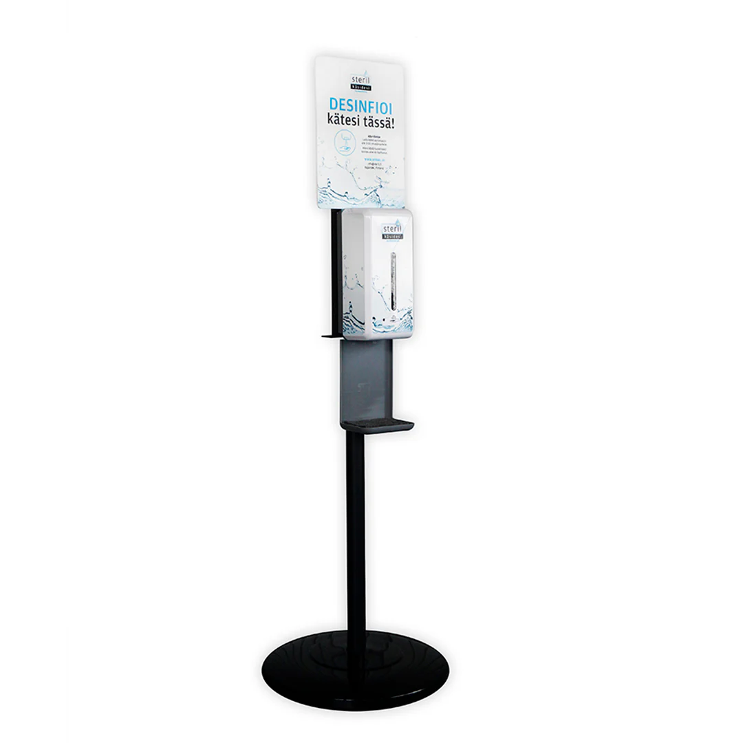 - Käsidesiautomaatti on mahdollista kustomoida yrityksen omalla ilmeellä.